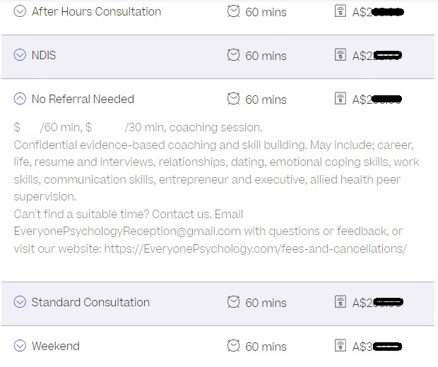 We offer a range of session options for clients who want to let us know they have specific funding needs (NDIS or WorkCover). Calendar availability is the same, except for ‘After Hours’.