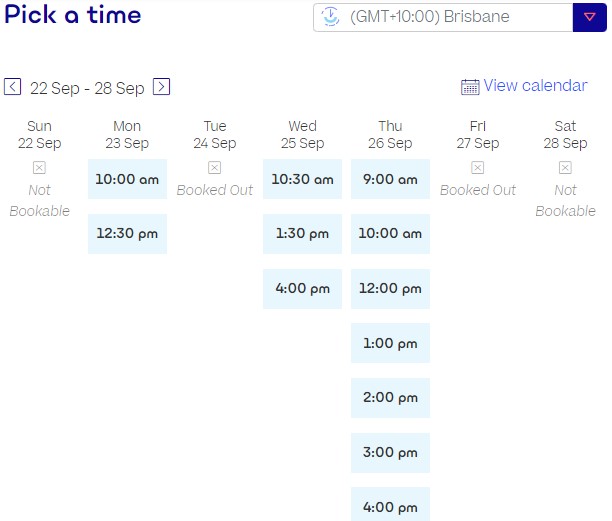 Helpful Tip: Use the arrows to move forward/backwards week-to-week, or click ‘view calendar’ to jump ahead.